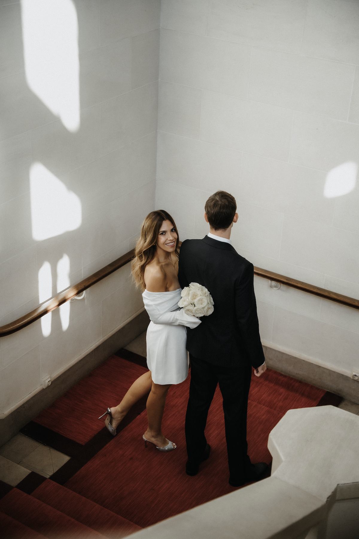 An intimate city-hall ceremony brought together the couple’s closest loved ones. French and American touches were woven throughout the ceremony and echoed across the rest of the day. Before making their grand entrance at the reception dinner, the couple slipped away for a romantic portrait session with a film photographer. The evening was marked by youthful energy, family closeness, and exceptional cuisine.
